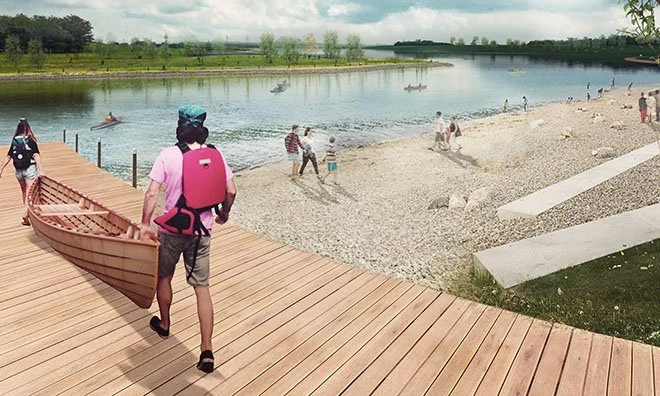 Previously used as a gravel quarry, North River Park, will be the key wildlife biodiversity zone, where forest and riparian restoration will take place. Construction includes topographic diversity, with hills created from earthmoving operations around wetlands. Within this portion, a north flood park will be developed, which will be designed to handle a one-in-one-hundred-year flood.